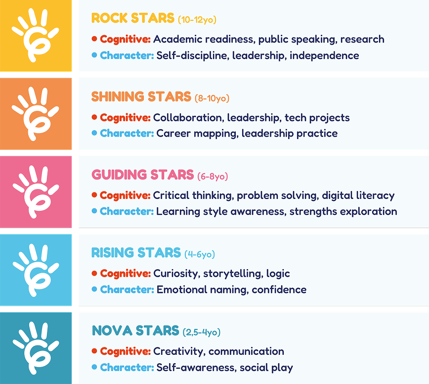 Our learning journey is divided into 5 levels, designed to match your child’s age and stage of development: